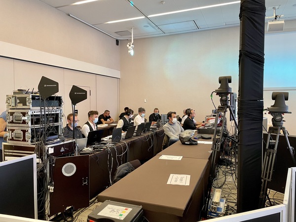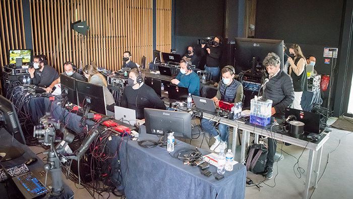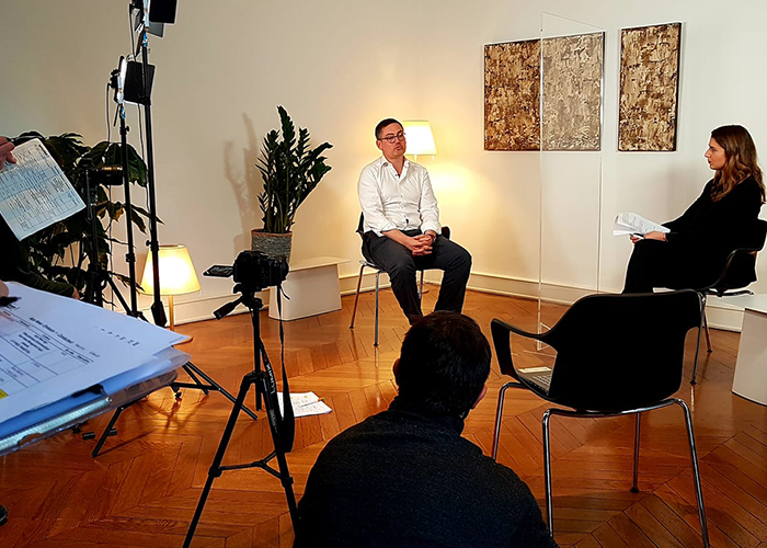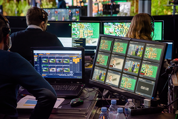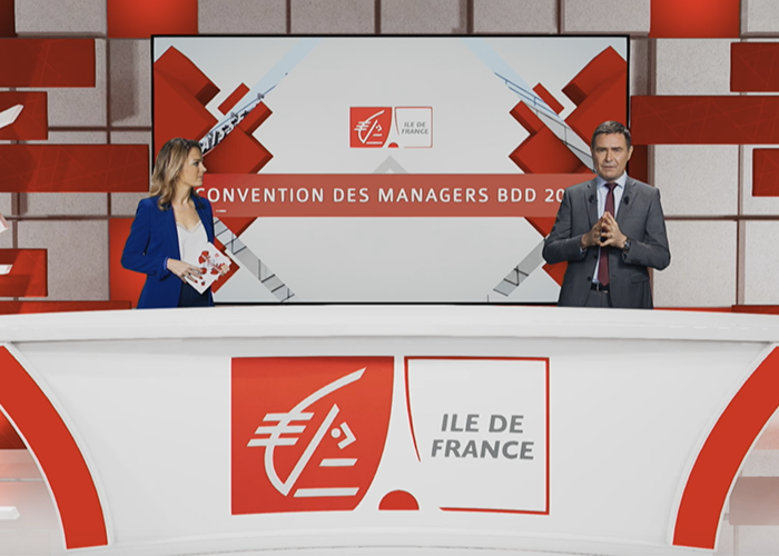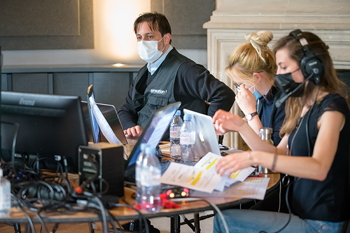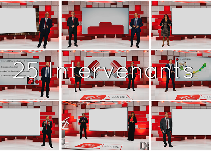 2. Le tournage sur 5 jours en studio (400m2) en fond gris (innovation technique) avec incrustation dans 2 décors 3D sur-mesure à l’aide de 22 caméras virtuelles. Tournage de 10 conventions d’une heure (avec 25 intervenants au total) selon les process Covid Safe.
