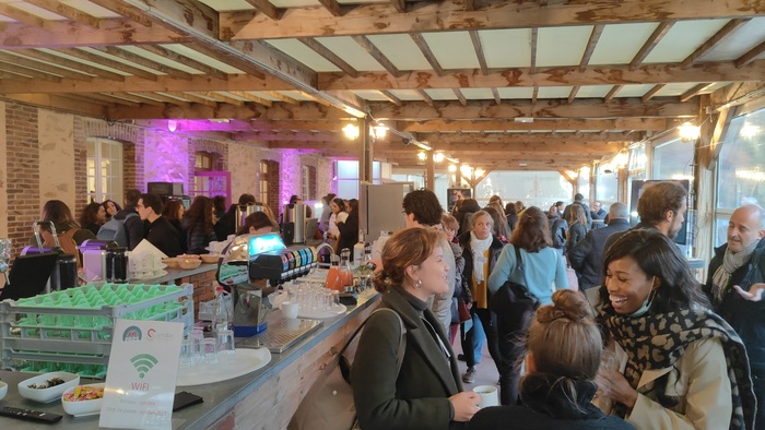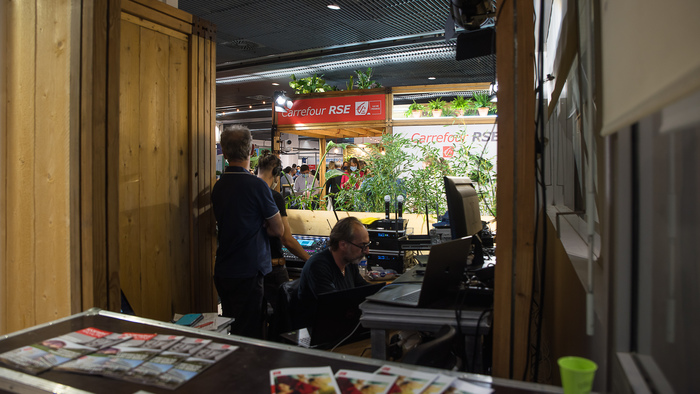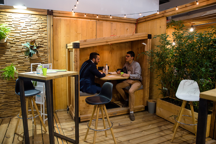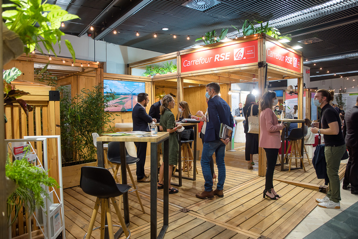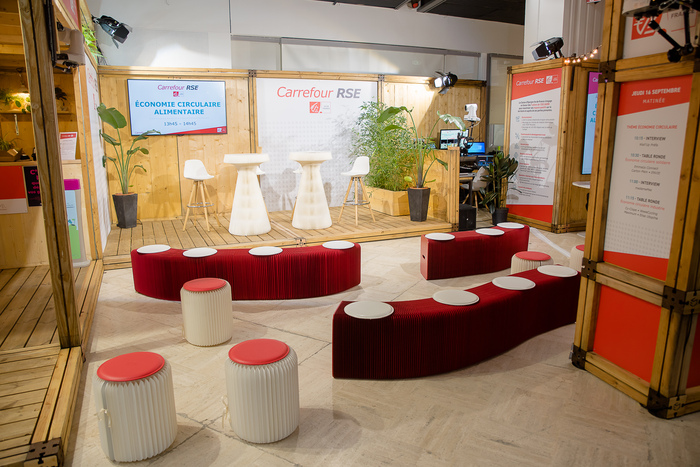 1. Un stand éco-conçu à partir de panneaux de bois réutilisables (et réutilisés), de visuels sur panneaux à base de matériaux recyclés, un mobilier extensible à base de carton (pour réduire le transport)… et enfin, un bar animé par du personnel en insertion (via une association).