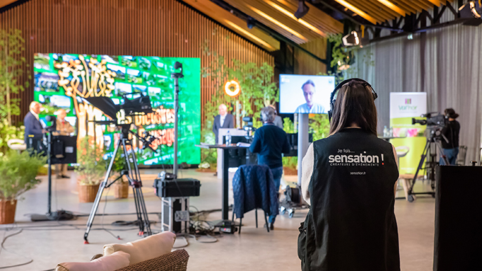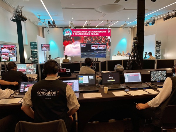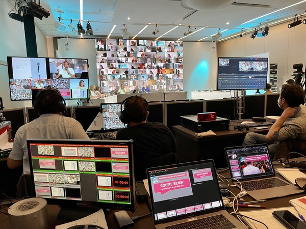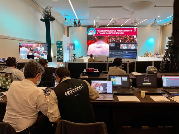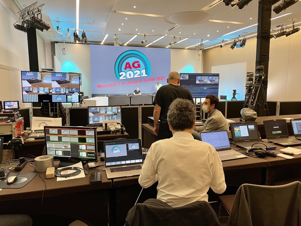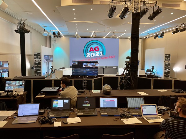 2. réalisation vidéo de l’AG durant 2 jours en diffusion directe à l’aide de plusieurs caméras, avec interactions live des 350 participants, visibles de tous sous forme de mosaïque géante, tout en sécurisant l’aspect technique, notamment la problématique de la latence lors des directs.