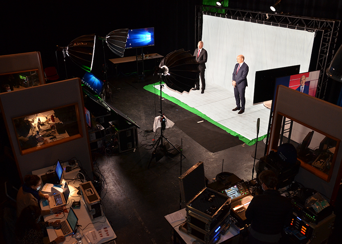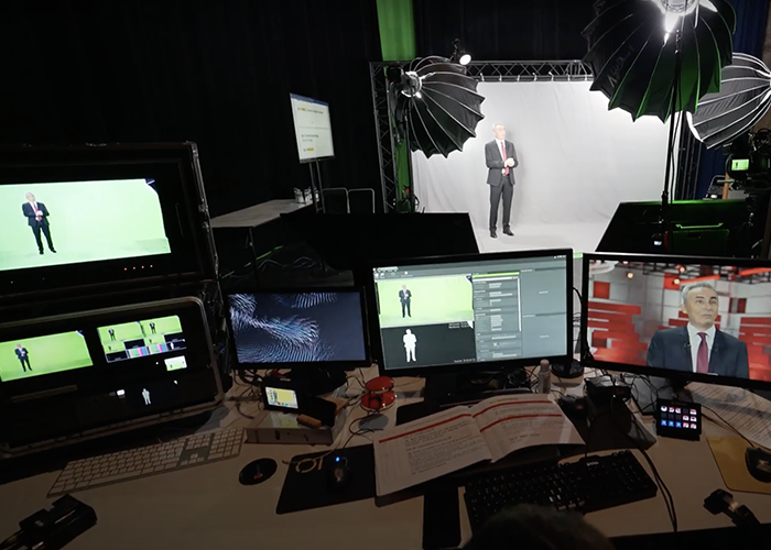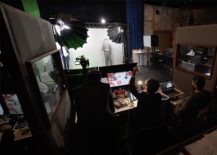 2. Shooting during 5 days in a custom-built studio (400 sqm) using grey background technology, with full insertion in 2 custom 3D sets, using 22 virtual cameras. Shooting of 10 one-hour conventions (25 speakers in total), respecting Covid Safe processes..
